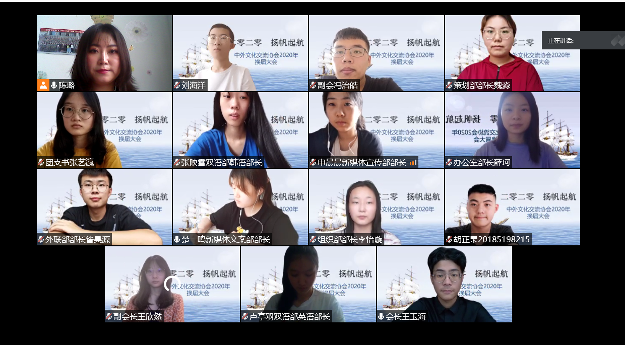 中外文化交流协会社团指导老师陈璐讲话中指出,2020年是极不平凡的一年,大家虽未能回到校园,但仍然共同努力、配合默契,成功举办多个线上社团精品活动。