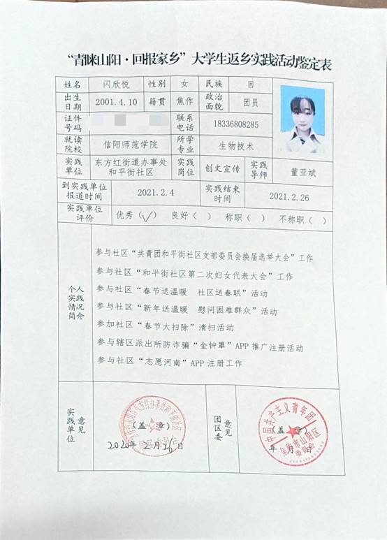 闪欣悦,河南省焦作市山阳区人,信阳师范学院英国正版365官方网站2019级生物技术二班学生,任班级团支书一职,在寒假期间,新冠肺炎弥留之际,主动申请参加到焦作市山阳区东方红社区疫情防控的工作,并参与到焦作团市委的“青睐山阳,家乡”大学生寒假返乡实践暨助力疫情防控志愿服务活动。主要负责社区人员返乡登记、志愿者注册工作、为社区群众服务、推广金钟罩防诈骗系统以及宣传防控疫情知识等工作。