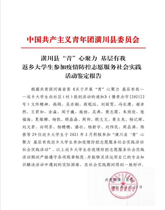 “时光荏苒,参加‘青’心聚力 基层有我社会实践活动”的潢川县返乡大学生朋友们马上就要结束实践活动,回到自己的大学校园。在这里,为各位青年大学生朋友们送上三点希望:一是希望大家在今后的学习、工作和生活中坚定理想信念,练就过硬本领,谱写青春篇章;二是希望大家继续秉承志愿精神,做“终身志愿者”,以模范的言行传播新文明,引领新风尚;三是希望大家能够一直关注潢川、支持潢川 ,在以后的学习、工作中,不忘家乡,做一名宣传家乡、建设家乡的青春使者”。这是县团委给她留下的谆谆教诲,她也必将牢记使命,不忘初心。