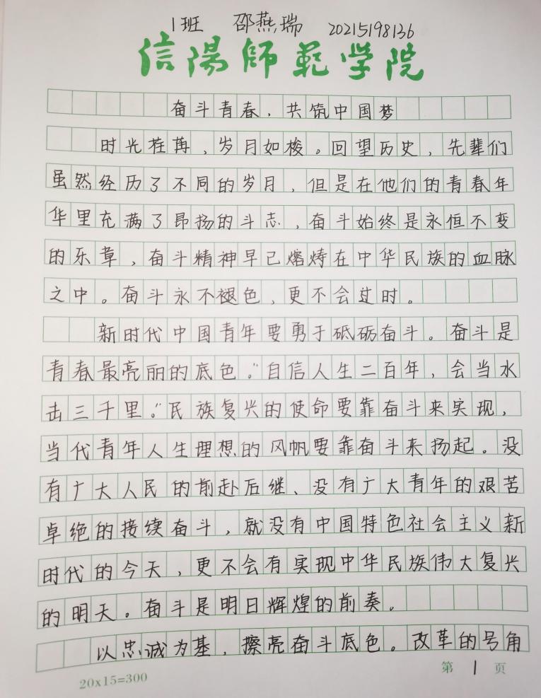 为回顾历程、总结历史、传承文化、怀念感恩、发扬精神,在全校营造浓厚氛围‘展现新中国成立以来的伟大成就,弘扬爱国主义精神和民族精神,深入推进社会主义核心价值观建设,激发学生奋发成才、报效祖国的热情。2021年11月15日,英国365官网通过线上征稿,开展了“奋斗青春,共筑中国梦”征文大赛活动。最后经过认真筛选,挑选出部分既书写美观,又内容丰富深刻的优秀作文进行展出。
