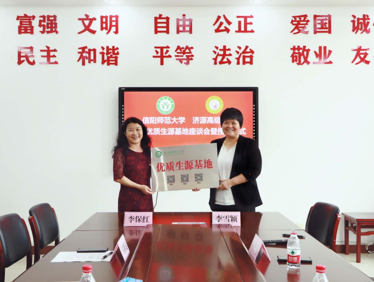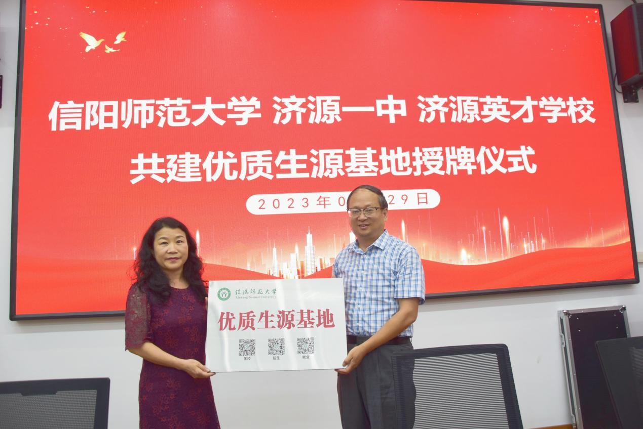 在与会人员见证下,院长李保红与济源市三所优质高中签订了合作意向书,举行了“优质生源基地”授牌仪式。本次活动达到了宣传学校招生政策,增进校友情感链接,深化校地互利合作的目的。