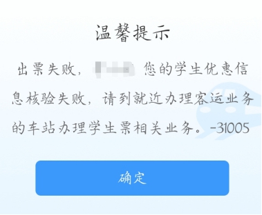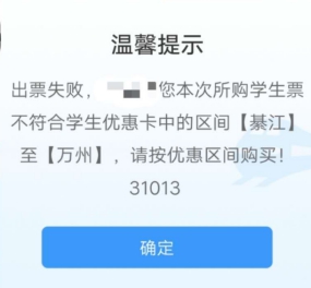 当学生买票在12306买票时提示优惠信息核验失败时(如下图3、图4所示),请学生在资质查询里仔细核查所绑定的优惠区间(如图1所示)是否是正确的站点名称,若发现绑定站点不正确或与实际乘车区间(学校--家庭)不符时,请尽快找老师修改优惠卡内站名名称,然后去车站自助机刷身份证、优惠卡重新绑定资质信息,重新绑定资质以后12306上资质信息区间修改成功后才可以买票!