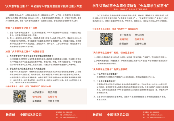 若有任何疑问,老师可致电028-61481462或技术支持电话1519805981115198059812咨询,学生可扫描优惠卡上的二维码关注“惠通学子”微信公众号了解学生资质绑定相关内容,学生在购票或在车站绑定资质遇到问题时,可在公众号内在线咨询。